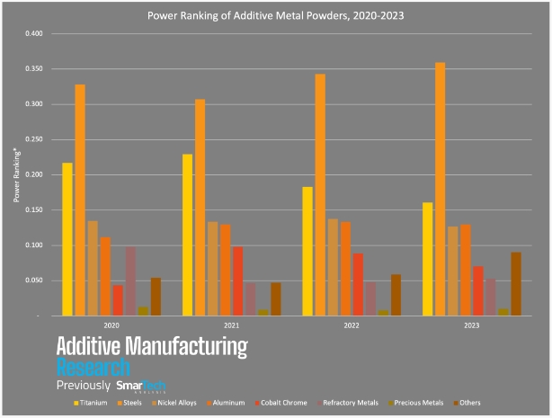近期,增材制造研究(AMR)公布了一項關于金屬材料使用率的相關調查結果,從其繪制的最新圖表中可看出金屬增材制造粉末中各種金屬的“實力排名”。
