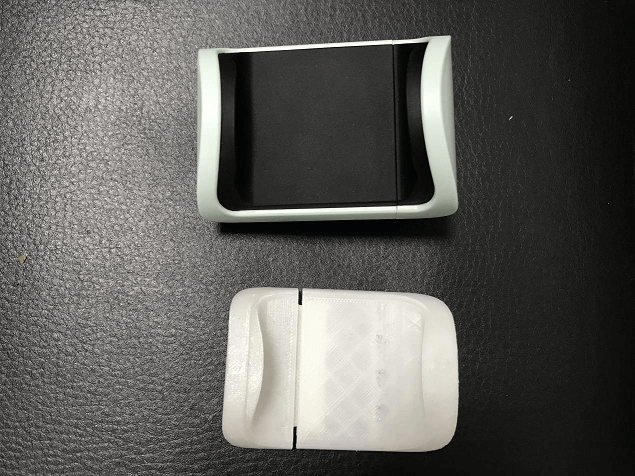 3D打印手機(jī)殼白模展示,對比實(shí)物圖,可以看得出來,大小尺寸經(jīng)過研發(fā)工程師的修改,更合適配套新款手機(jī)尺寸。